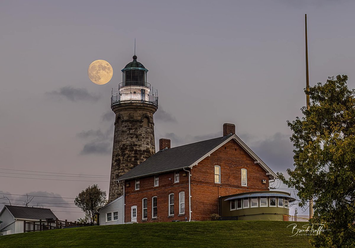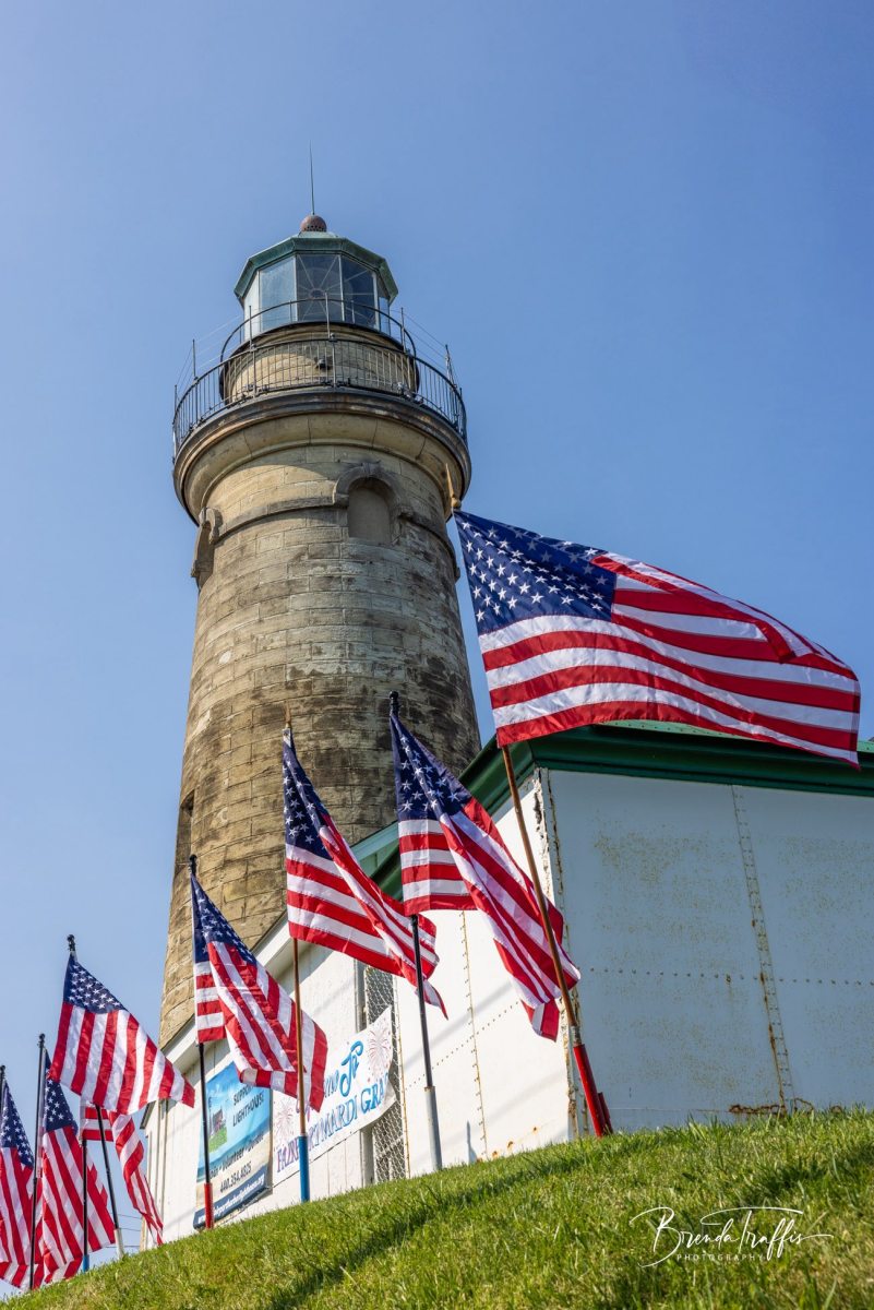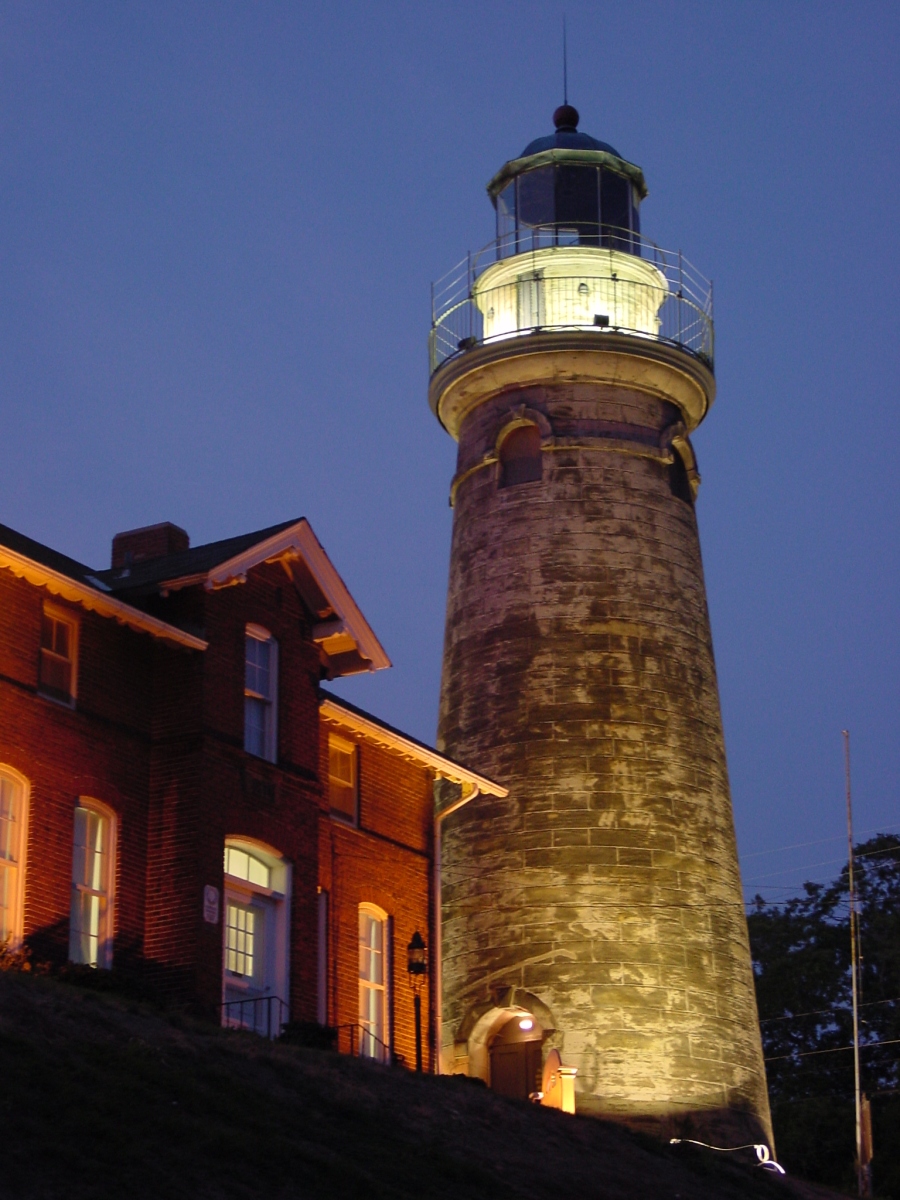 The original lighthouse was completed in 1825. The tower stood thirty feet high, capped with an octagonal-shaped iron lantern. The lighthouse was accompanied by a two-story keeper’s house. Due to deterioration the tower and keeper’s house had to be replaced. Rebuilt in 1871, the tower now stands sixty feet high and has a spiral staircase of 69 steps which leads to an observation platform. In 1925 the light in the tower (a third-order Fresnel lens) was discontinued. It was replaced by a combination light and foghorn station which was built on the west breakwater pier head.
