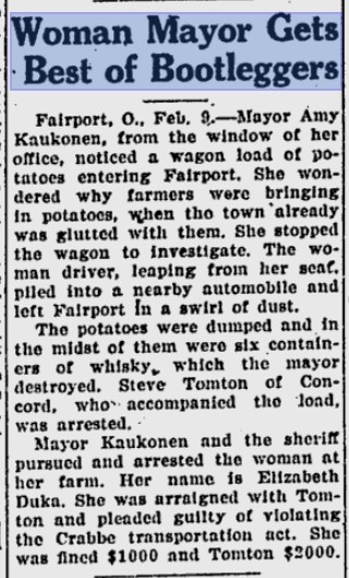 Once in office, Mayor Kaukonen waged an ongoing battle with a reelected marshal, J.H. Werbeach, who ignored Fairport’s bootlegging activities. Threats were made against her. Two tumultuous years followed. Werbeach’s sudden death in 1923 allowed her to appoint Leander Congos as the new marshal. A newly motivated and willing council led to other positive changes. Amy’s Mayors Court revoked alcohol permits, jailed bootleggers, and promoted bootleg eradication plans in the village. In 1922, she used the Homeland Security provisions of the era to issue Mayor’s warrants to search homes for those in violation of the Volstead Act. Her star presence garnered accolades in New York, Cleveland, Columbus, and Boston. President Warren G. Harding lauded her efforts. Fairport Harbor was changing. After decades of corruption and illegal dock activities, her civic policies led to paved streets, a water service, fire service, police service, and new and improved public schools being established. Dr. Kaukonen continued to deliver babies and maintain her private practice throughout this transformation.