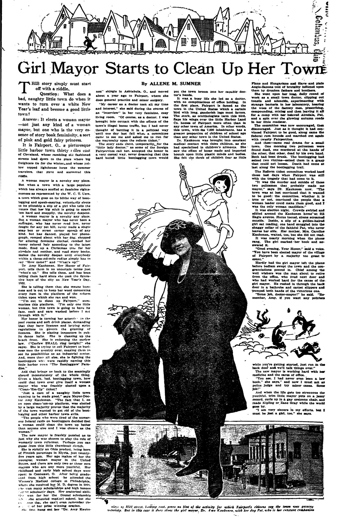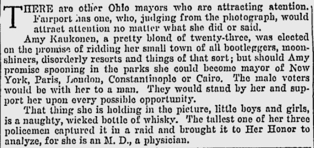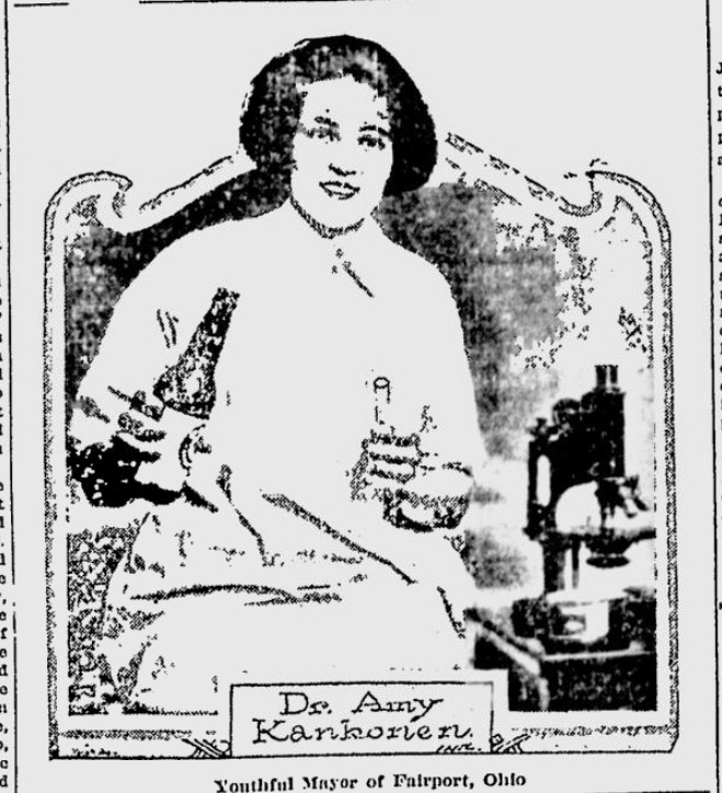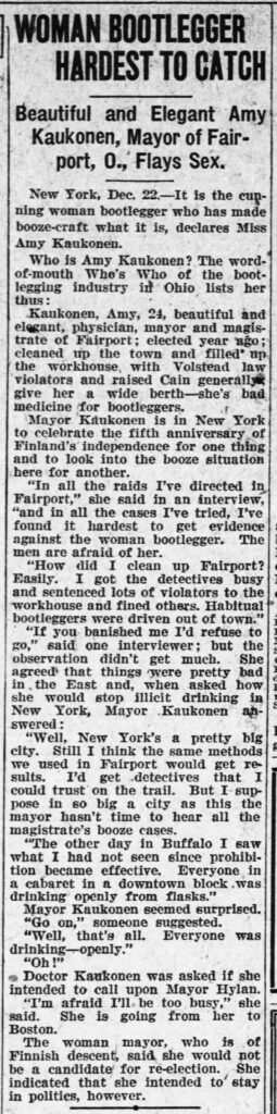 Historically, Dr. Amy Kaukonen was the first woman mayor elected in Ohio, probably, the second in the country. Dr. Kaukonen was also the first Finnish woman doctor in the U. S. Born in Elyria, Ohio in the year 1891, the Kaukonens moved to Conneaut, Ohio, where Amy finished number one in her Conneaut High School class. She also finished number one in her class at the Women’s Medical College of Philadelphia, Pennsylvania. She started a practice in Fairport Harbor in 1920. Witnessing the many medical maladies associated with the whiskey runners, moonshiners, and rowdy public at large, it was no surprise that Dr. Amy Kaukonen became a staunch opponent against the alcohol, dance halls, and corrupt government mores of the Fairport community. Her public views attracted the attention of Fairport’s Kasvi Temperance Hall. She was approached by the People’s Reform Party and benefiting from the recently passed 19th Amendment, Dr. Kaukonen became a candidate for public office. In 1921, she beat her mayoral opponent William Stange by 75 votes. History was made.